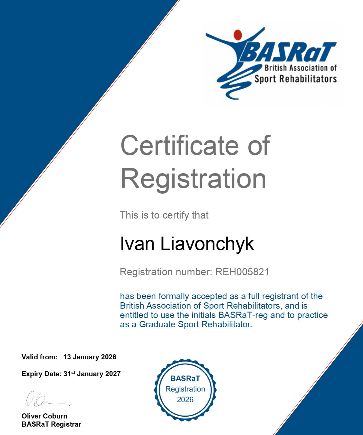 ✔Member of the British Association of Sport Rehabilitators(BASRaT)